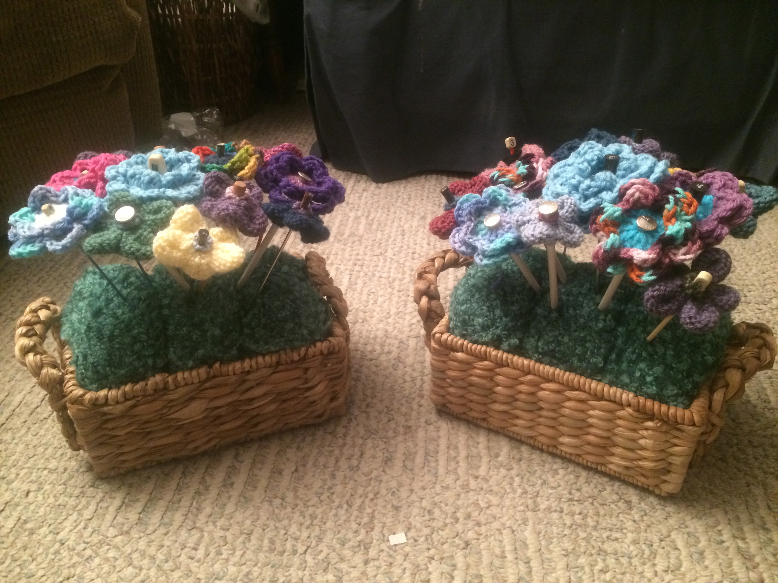Everyone at her service was given a knitted or crochet flower attached to a pin to wear in her memory. These flowers were made by friends, family members and their yarn loving networks around the globe. Here is a picture of the arrangements made from the flowers attached to her own knitting needles and held in place by her yarn.
