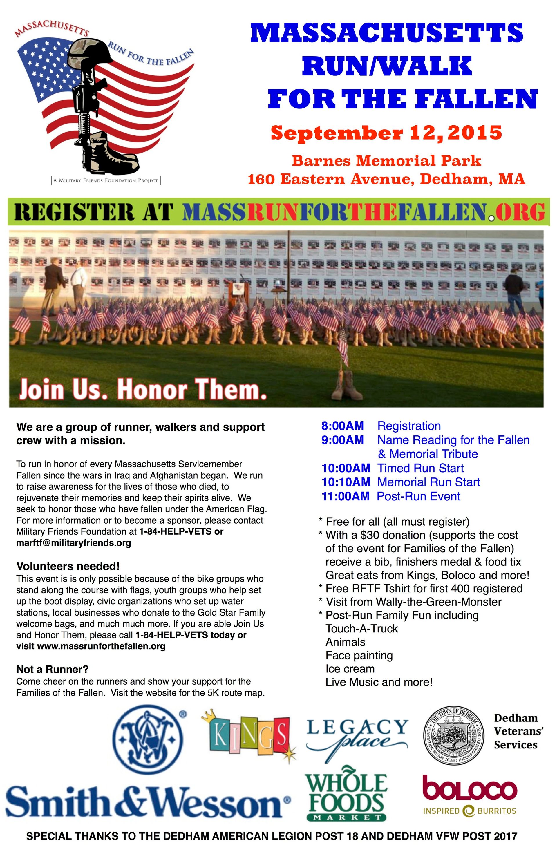 I urge you to visit their website, www.militaryfriends.org , to explore all of their amazing work and hope you'll join me on September 12th in Dedham, MA for the Run/Walk For The Fallen. For more information, click on the flyer pictured here. (Click on the image to enlarge)